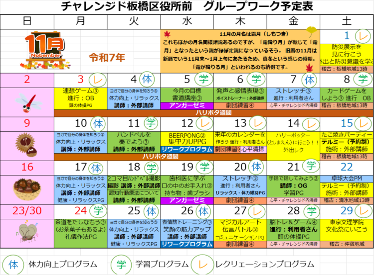 気がつけば今年もあと2ヶ月となりましたが、皆さんいかがお過ごしでしょうか。一気に秋の気配から冬の足音まで聞こえてくる季節となりました。季節の変わり目で、体調を崩される方も多い中、チャレンジドでは体力向上系のグループワークを行うとともに、朝に簡単な耳ストレッチや呼吸法を取り入れており、体調を維持できるようなプログラムを行っております。本日は11月のグループワークをご紹介いたします。