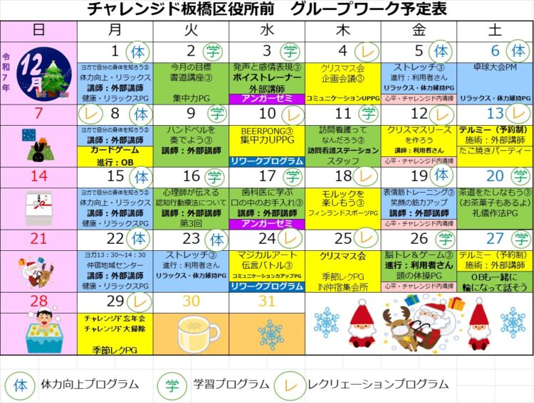 冬の寒さも本格的となり、今年も残り1ヶ月となりました。チャレンジドでは寒さに負けず、11月から12月にかけて、4名の就職が決まりました。みなさん改めておめでとうございます。本日は2025年12月のグループワークをご紹介します。
